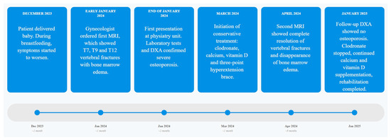 Chronological overview of patient’s clinical pathway with linear timeline from: symptom onset, imaging, pharmacological treatment, rehabilitation phases and follow-up DXA results over a 12-month period.