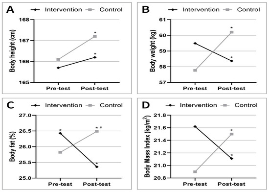 Changes in anthropometric variables ((A): Height, (B): Weight, (C): Body fat percentage, (D): Body Mass Index) between pre- and post-measurements for intervention and control groups. Significant differences (# p < 0.05; Control vs. Intervention groups) and changes (* p < 0.05; pre-test vs. post-test) are indicated.