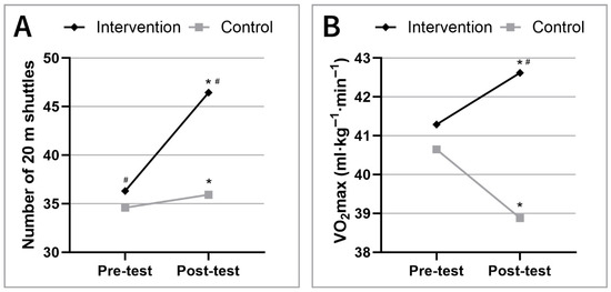 Trends in 20 m shuttle run performance (A) and VO2max (B) over the study period. Significant increase in the cardiorespiratory performance of the intervention group was seen compared to the control group. Significant differences (# p < 0.05; Control vs. Intervention groups) and changes (* p < 0.05; pre-test vs. post-test) are indicated.