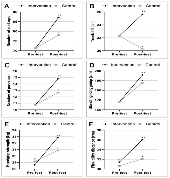 Improvements in muscular strength and flexibility (A): Curl-Ups, (B): Trunk lift, (C): Push-Ups, (D): Standing Long Jump, (E): Handgrip strength, (F): Flexibility) over the study period. The intervention group showed significant improvements in all metrics compared to the control group (* p < 0.05 pre-test vs. post-test, # p < 0.05 Control vs. Intervention groups).