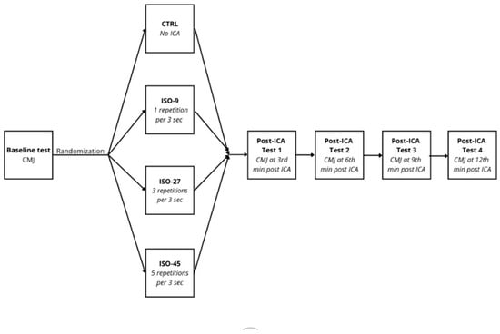Study design flowchart. CMJ—countermovement jump; ICA—isometric conditioning activity; CTRL—control condition (without ICA); ISO-9—isometric muscle action condition with total ICA duration of 9 s in 3 sets; ISO-27—isometric muscle action condition with total ICA duration of 27 s in 3 sets; ISO-45—isometric muscle action condition with total ICA duration of 45 s in 3 sets.