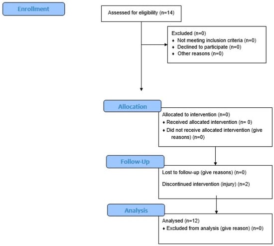 The study involved 12 highly trained male volleyball players classified based on training status and performance caliber according to McKay et al.’s [25] classification (Table 1). The athletes reported a total training volume of approximately 13 h per week (volleyball practice combined with strength training), which was confirmed by the team’s strength and conditioning coach. The inclusion criteria were as follows: (a) at least 5 years of experience in volleyball training, (b) engagement in a minimum of 3 strength training sessions per week over the last 5 years, and (c) no history of musculoskeletal injuries resulting in a training interruption exceeding 4 weeks for at least 6 months prior to the study commencement. Participants were instructed to adhere to their habitual dietary patterns and to refrain from consuming supplements or stimulants, with the exception of regular supplementation (e.g., creatine) during the week preceding the experiment. Body composition was assessed during the experimental session using multi-frequency bioelectrical impedance analysis under standardized laboratory conditions (InBody 770, Biospace Co., Ltd., Seoul, Republic of Korea). Prior to participation, all individuals received detailed information regarding the potential risks and benefits of the study, as well as their right to withdraw at any time without justification and subsequently provided written informed consent. The study employed a randomized crossover design. While participants were aware of the immediate task they performed (e.g., isometric contractions vs. walking), they remained blinded to the study’s overarching objectives and specific hypotheses. Randomization was carried out using the randomization.org generator, which allocated a unique number and sequence for each participant’s session. After being assigned to a specific study condition, participants were kept unaware of the subsequent stages of the experiment [17]. Detailed information regarding the study’s objectives and anticipated outcomes was also withheld from participants. During the experiment, two participants were excluded due to injuries unrelated to the study. Consequently, the experiment was completed by 12 participants (Figure 2). The entire research protocol was conducted at the Academy of Physical Education in Katowice, Poland. The experiment received ethical approval from the Bioethics Committee for Scientific Research (03/2021) at the Academy of Physical Education in Katowice, in compliance with the ethical guidelines outlined in the 1983 Declaration of Helsinki.