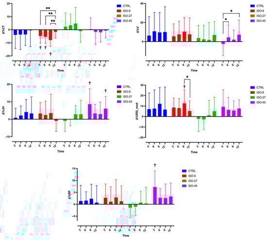 Dynamics of percentage change (Δ%) in CMJ-derived variables across time points (3′, 6′, 9′, and 12′) relative to pre-test (0%) following the ICA or CTRL. Colored bars denote conditions: CTRL (blue), ISO-9 (3 × 1 × 3-s), ISO-27 (3 × 3 × 3-s), or ISO-45 (3 × 5 × 3-s). Statistical significance: * p < 0.05; ** p < 0.01; † different from reference (*0%). CTRL—control condition; ISO-9—1 repetition of 3 s maximal isometric contractions per set; ISO-27—3 repetitions of 3 s contractions per set; ISO-45—5 repetitions of 3 s contractions per set; JH—jump height; RP—relative peak power output; RSI_mod—modified reactive strength index; CT—contraction time; V—eccentric peak velocity.