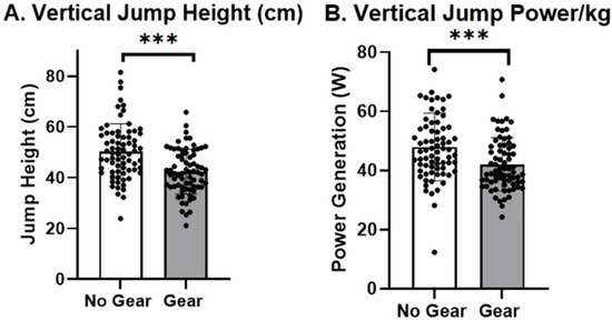 Static vertical jump was assessed to investigate the dependent variables of jump height, vertical jump power output per kilogram, and independent bilateral leg power output in the No Gear and Gear conditions. A repeated-measures MANOVA revealed a significant multivariate effect of gear (Pillai’s Trace = 0.586; F(1;71) = 100.35; p < 0.001), indicating that performance differed between the Gear and No Gear conditions across the vertical jump outcomes. A significant gear × jump measure interaction (Pillai’s Trace = 0.730; F(2;70) = 94.78; p < 0.001) suggested the effect of gear varied across jump height, jump power, and power/kg. Univariate ANOVAs confirmed significant main effects of Gear (F(1,71) = 100.35; p < 0.001) and measure (F(2,142) = 1363.98; p < 0.001), as well as a significant gear × measure interaction (F(2,142) = 35.33; p < 0.001). Greenhouse–Geisser corrections indicated that these effects remained robust despite violations of sphericity.