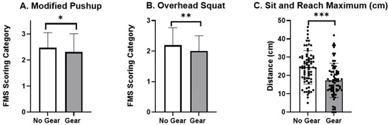 Comparison mobility and flexibility assessments in the Gear and No Gear conditions. Note: Score of 1: Inability to perform or complete the functional movement pattern. Score of 2: Ability to perform the functional movement pattern, but some degree of compensation was noted. Score of 3: Unquestioned ability to perform the functional movement pattern. Cm = centimeters; * = statistical significance; * p = 0.05–0.02; ** p = 0.01–0.002; *** p < 0.001.