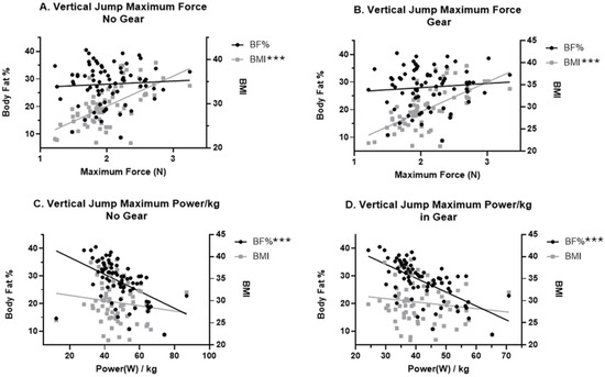 A repeated-measures MANCOVA was conducted to examine the effect of the Gear and No Gear conditions on vertical jump performance outcomes (jump height, vertical jump power, and vertical jump power relative to body mass (kg)), while controlling for the body mass index (BMI) and body fat percentage. The multivariate test revealed significant main effects of condition, BMI, and BF% on the combined dependent variables (Wilks’ Λ = 0.85, F(3,136) = 8.28, p < 0.001; Wilks’ Λ = 0.36, F(3,136) = 79.62, p < 0.001; and Wilks’ Λ = 0.61, F(3,136) = 29.17, p < 0.001, respectively). Follow-up univariate ANCOVAs indicated that condition significantly influenced jump height (F(1,138) = 12.41; p < 0.001; partial η2 = 0.72), with participants demonstrating lower jump height in the Gear condition compared to the No Gear condition. Condition did not significantly affect jump power (F(1,138) = 0.40; p = 0.53; partial η2 = 0.48) or relative jump power (per kg body mass) (F(1,138) = 1.71; p = 0.19; partial η2 = 0.42). A higher BMI and body fat percentage were consistently associated with poorer vertical jump performance across models (Figure 4). Body fat percentage demonstrated large effects on jump height (partial η2 = 0.40), absolute power (0.29), and relative power (0.34) (Figure 4). BMI contributed smaller but significant effects, particularly for absolute power (partial η2 = 0.32) (Figure 4). These results indicate that wearing gear significantly reduced jump height but did not significantly affect vertical jump power or power relative to body mass when controlling for BMI and BF%. Body fat percentage emerged as a strong negative predictor of vertical jump performance across outcomes, whereas BMI showed smaller, but still meaningful, associations.