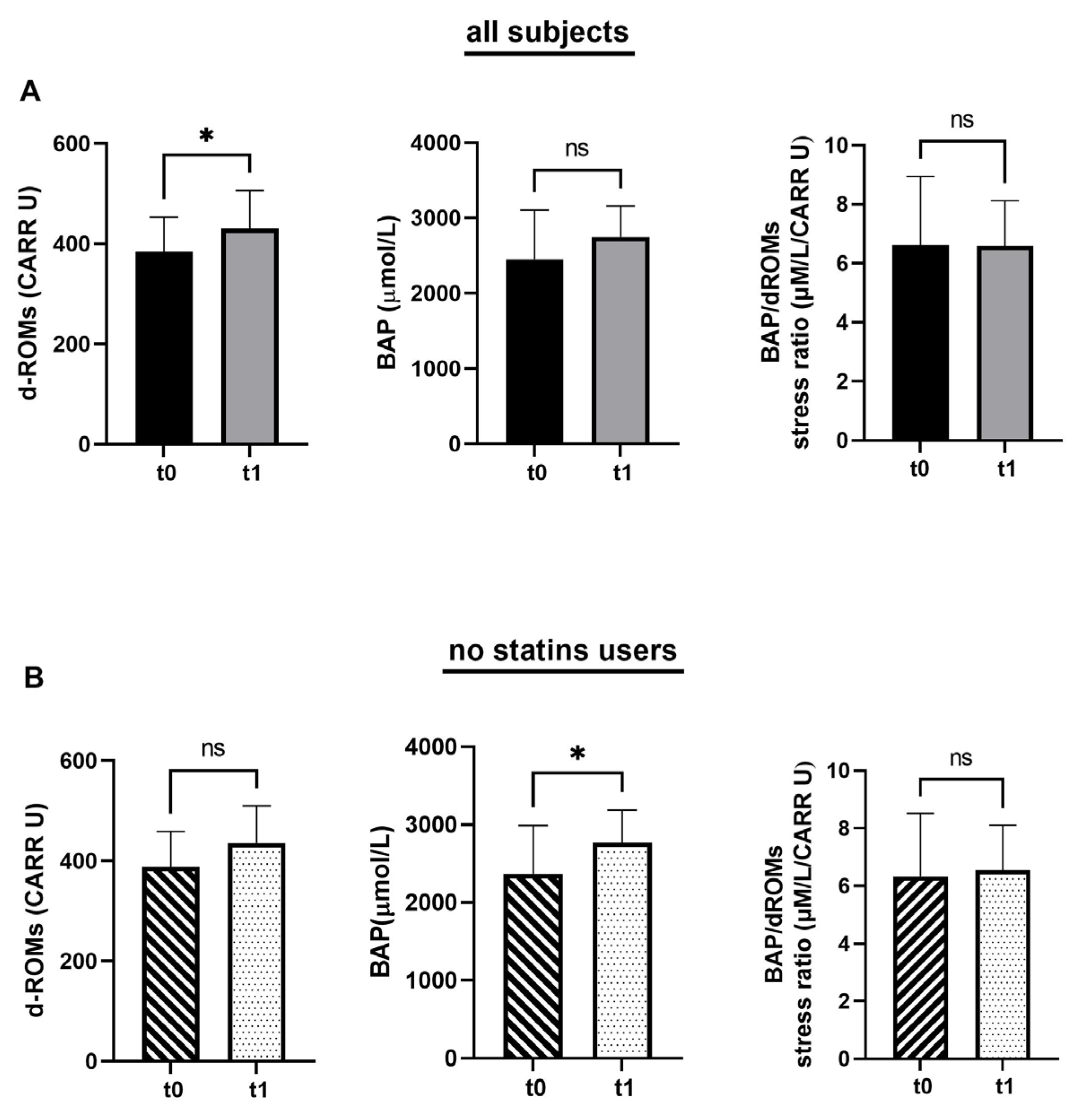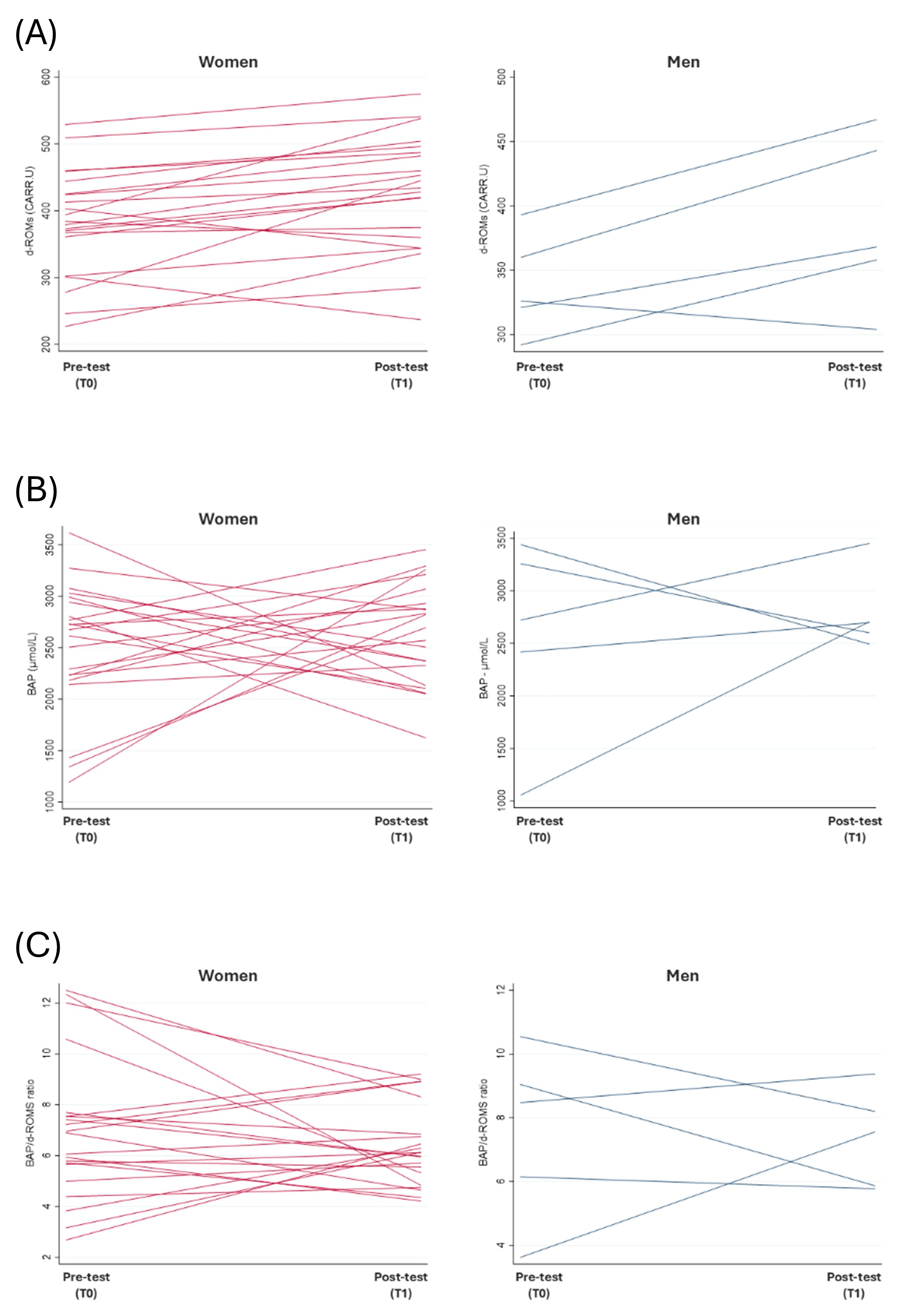 d-ROMs (U.CARR) | 383.2 ± 79.3 | 426.8 ± 87.3 | p < 0.01 (a) | 338.4 ± 38.9 | 388.0 ± 66.4 | n.s. (a) p = 0.0796 |