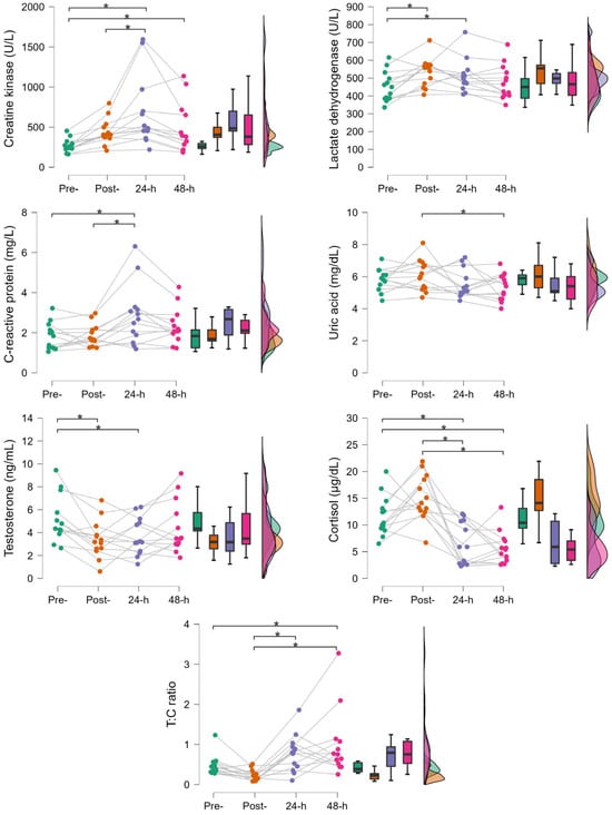 Time course changes in biomarkers of exercise-induced muscle damage (creatine kinase, lactate dehydrogenase), inflammation (C-reactive protein), oxidative stress (uric acid), and endocrine response (testosterone, cortisol, testosterone to cortisol ratio). Each panel includes a sinaplot with individual changes and mean differences (* p < 0.05), a box plot with median values and the interquartile range, and a half-violin plot with the kernel probability density of the values.
