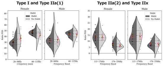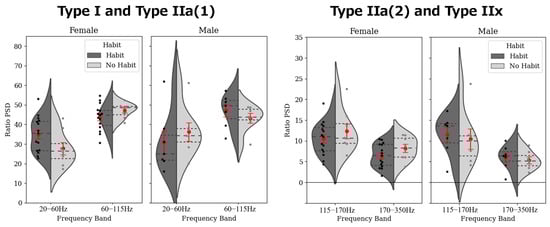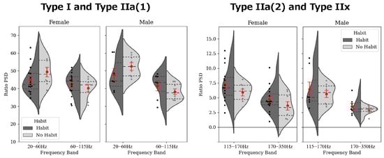Figure 2), the trends in effect sizes and visual patterns implied distinct recruitment strategies between the groups. Specifically, the higher relative power in the 20–60 Hz band in the non-training group and in the 60–115 Hz band in the training group suggests a shift toward fast-twitch fiber recruitment in trained individuals. Notably, the directionality of these effect sizes was consistent across sexes, indicating a potentially universal influence of training on recruitment patterns, regardless of sex. Moreover, the relatively large effect sizes observed in females within the type IIa(2) and type IIx frequency bands may offer insights into sex-specific adaptations in fiber recruitment. Wakeling et al. previously reported spectral changes in the 40–60 Hz and 170–220 Hz bands associated with muscle fatigue, which aligned with the frequency ranges observed in our study despite our focus on non-fatiguing dynamic tasks [