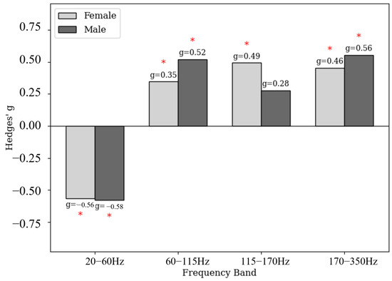 Across all frequency bands, small-to-moderate or large effect sizes were observed. In the 20–60 Hz band, both males and females showed moderate-to-large negative effect sizes, suggesting a relatively higher ratio PSD in the non-exercise group. In females, large effect sizes were observed in the 115–170 Hz and 170–350 Hz bands. In males, moderate-to-large effect sizes were identified in the 60–115 Hz and 170–350 Hz bands. Notably, the direction of effect sizes was consistent between the sexes across all frequency bands, indicating a shared pattern of PSD distribution differences based on resistance training status.