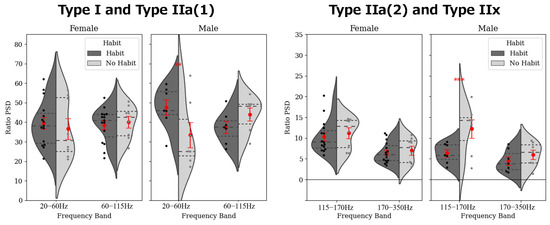 31]. In our study, these findings align with the elevated high-frequency PSD contributions observed in the trained male participants. Conversely, female participants exhibited higher relative power in the 20–60 Hz band and lower relative power in the 60–350 Hz band. Notably, several females in the training group displayed low MVC torque values despite their training status. According to a meta-analysis by Nuzzo et al. (2024), women tend to have a higher proportion of type I fibers and smaller cross-sectional areas of type II fibers than men [