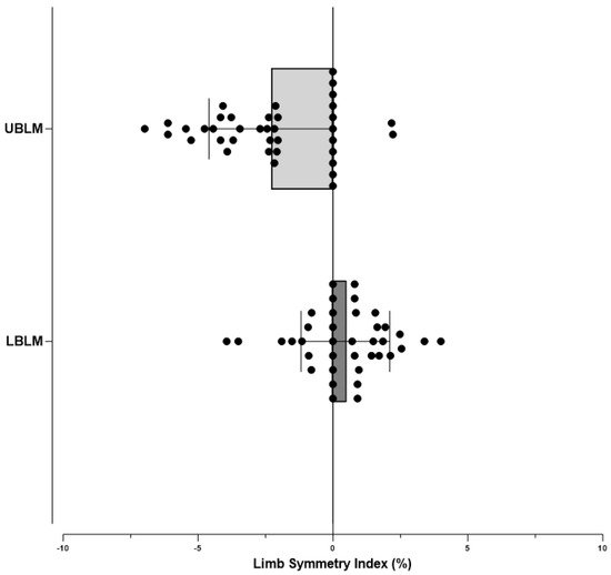 Figure 2 illustrates the LSI for the UBLM and LBLM. The distribution of UBLM values showed greater variability, with the median shifted slightly toward negative values, indicating reduced symmetry compared to LBLM. In contrast, LBLM values were more tightly clustered around zero, with a narrower interquartile range, suggesting higher symmetry between limbs.