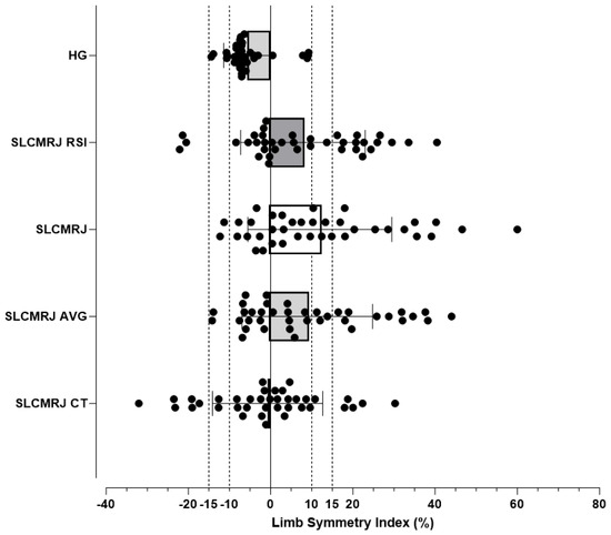 Limb Symmetry Index of Handgrip Strength (HG), Single-Leg Countermovement Rebound Jump (SLCMRJ), SLCMRJ Reactive Strength Index (RSI), SLCMRJ Average (AV), SLCMRJ Contact Time (CT).