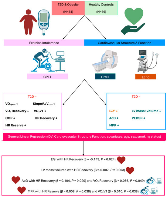 This secondary analysis of the DIASTOLIC trial [26] revealed two key findings: Firstly, all the CPET indices of exercise tolerance assessed, which included ventilatory efficiency (SlopeVE/VCO2), O2 recovery, HR recovery, HR reserve, O2VT, and COP, are impaired in people with obesity and T2D compared to age-, sex-, and ethnicity-matched healthy controls. Secondly, O2 recovery, HR recovery, and O2VT all revealed significant associations with markers of cardiovascular structure/function independent of age, sex, and smoking status. A visual summary of the key findings is presented in Figure 1.