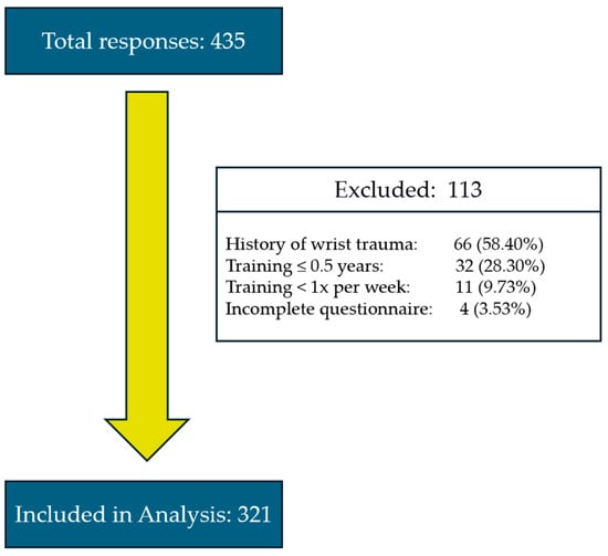 A total of 434 individuals completed the online questionnaire. Following the application of predefined exclusion criteria, 113 responses were excluded, resulting in a final analytic sample of 321 participants. The participant flowchart (Figure 1) details the exclusion process and final sample selection.