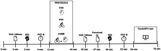 A randomized crossover experimental design with repeated measures was carried out. Participants came to the lab at five different times (i.e., during the familiarization stage, a baseline session for the decision-making in soccer test, and the three protocols in a random order). The protocols performed were the following: (i) COG protocol (i.e., performing a paper version of the incongruent Stroop test for 30 min); (ii) PHYS protocol (i.e., riding on a cycloergometer maintaining the intensity between 65 and 75% of the individual estimated peak heart rate [21] for 30 min); and (iii) COMB protocol (i.e., cycling on a cycloergometer, with an intensity between 65 and 75% of their estimated peak heart rate, while simultaneously performing an incongruent Stroop test in paper form for 30 min) (see Figure 1). Continuous EEG signal, perceived MF, and psychomotor performance were measured before and after each protocol. Perceived mental load and decision-making in soccer were measured after each protocol. For the duration of the study, participants were encouraged to maintain their usual daily habits regarding caffeine intake, but they were encouraged not to ingest alcohol and to try to sleep well. Measurements were performed at the same time of day (between 4 and 9 pm) at least 48 h after a soccer training session and between sessions.