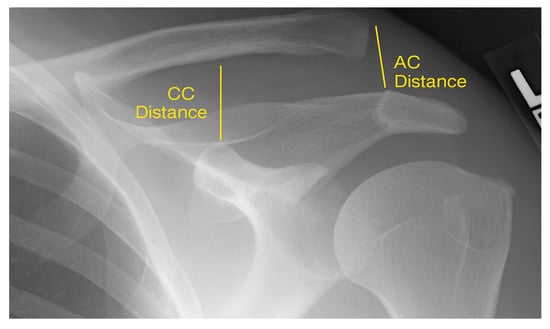 Anteroposterior radiograph of the shoulder demonstrating measurement of the acromioclavicular (AC) distance and the coracoclavicular (CC) distance.