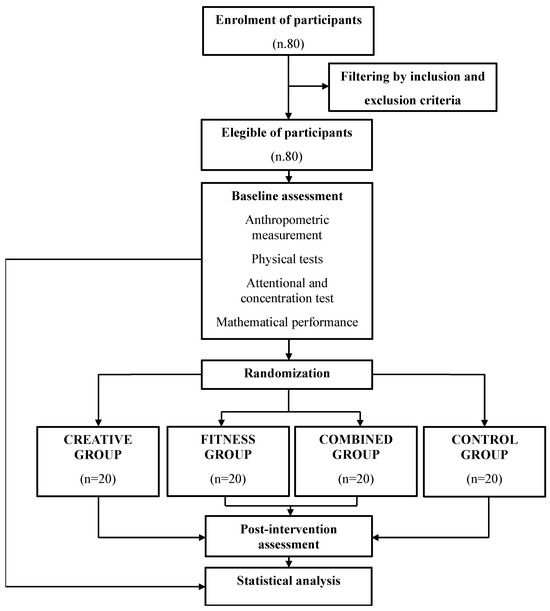 Eighty students were recruited for the study from primary schools in Campobasso (Italy). After the baseline assessment, the classes were randomly assigned to three experimental groups (EGs) distinguished by the type of protocol performed and a control group (CON) that did not participate in any AB intervention: creativity-based AB (CRE; n = 20), fitness-based AB (FIT; n = 20), combined AB (COM; n = 20), and control group (CON; n = 20).The ABs were performed twice on the same school day for 10 min per AB session, three times per week for 12 weeks. Sample characteristics are shown in Table 1.