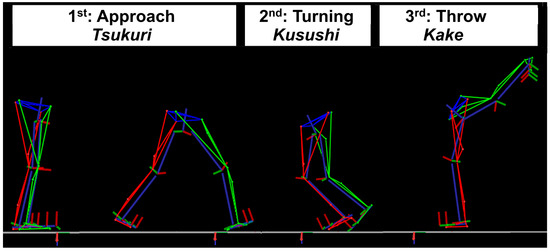 Sagittal view of the photogrammetry analysis of uchi-mata, divided into the Approach (Tsukuri), Turning (Kuzushi), and Throw (Kake) phases. Red represents the left lower limb, green the right lower limb, and blue lines indicate the mechanical axes of the anatomical segments.