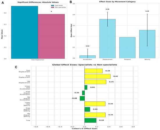 Global movement analysis comparing Specialists and Non-specialists across all technique phases. (A) Absolute values comparison for significant variables with statistical markers (* p < 0.05); (B) Mean effect sizes by movement category showing displacement parameters demonstrate the largest differences; (C) Effect sizes for all biomechanical variables with color coding indicating magnitude (yellow = small effect ≥ 0.2, green = negligible effect < 0.2).