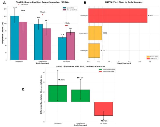 Analysis of final Uchi-mata position comparing specialists and non-specialists. (A) shows mean heights (±SD) for foot, knee, and hip positions with F-statistics, p-values, and significance markers (* p < 0.05, *** p < 0.001). (B) displays effect sizes (ηp2) with reference lines indicating small (0.01), medium (0.06), and large (0.14) effect thresholds. (C) illustrates group differences with 95% confidence intervals.