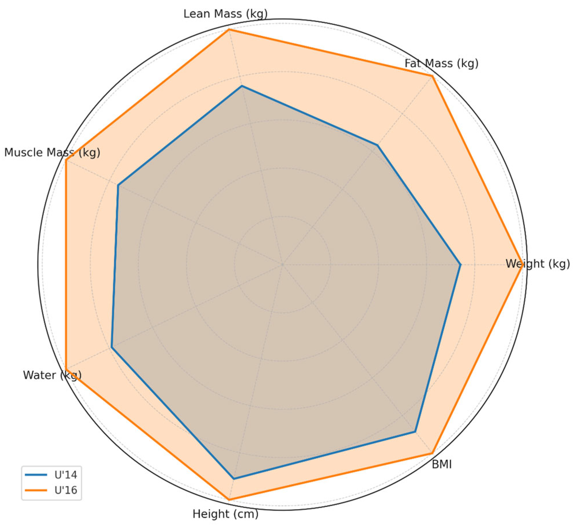The body composition analysis revealed substantial differences between the U’14 and U’16 players, particularly in body weight, fat-free mass, muscle mass, and total body water, all of which were significantly higher in the older group.