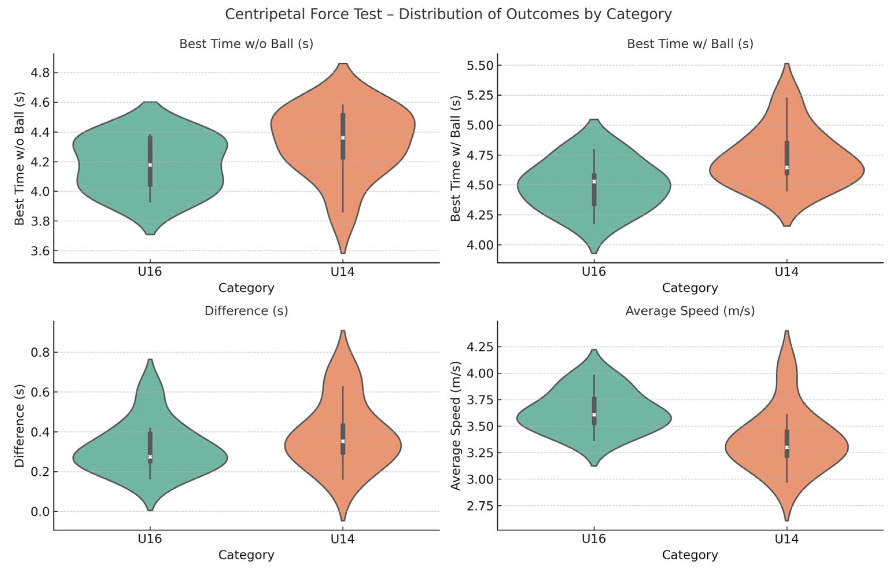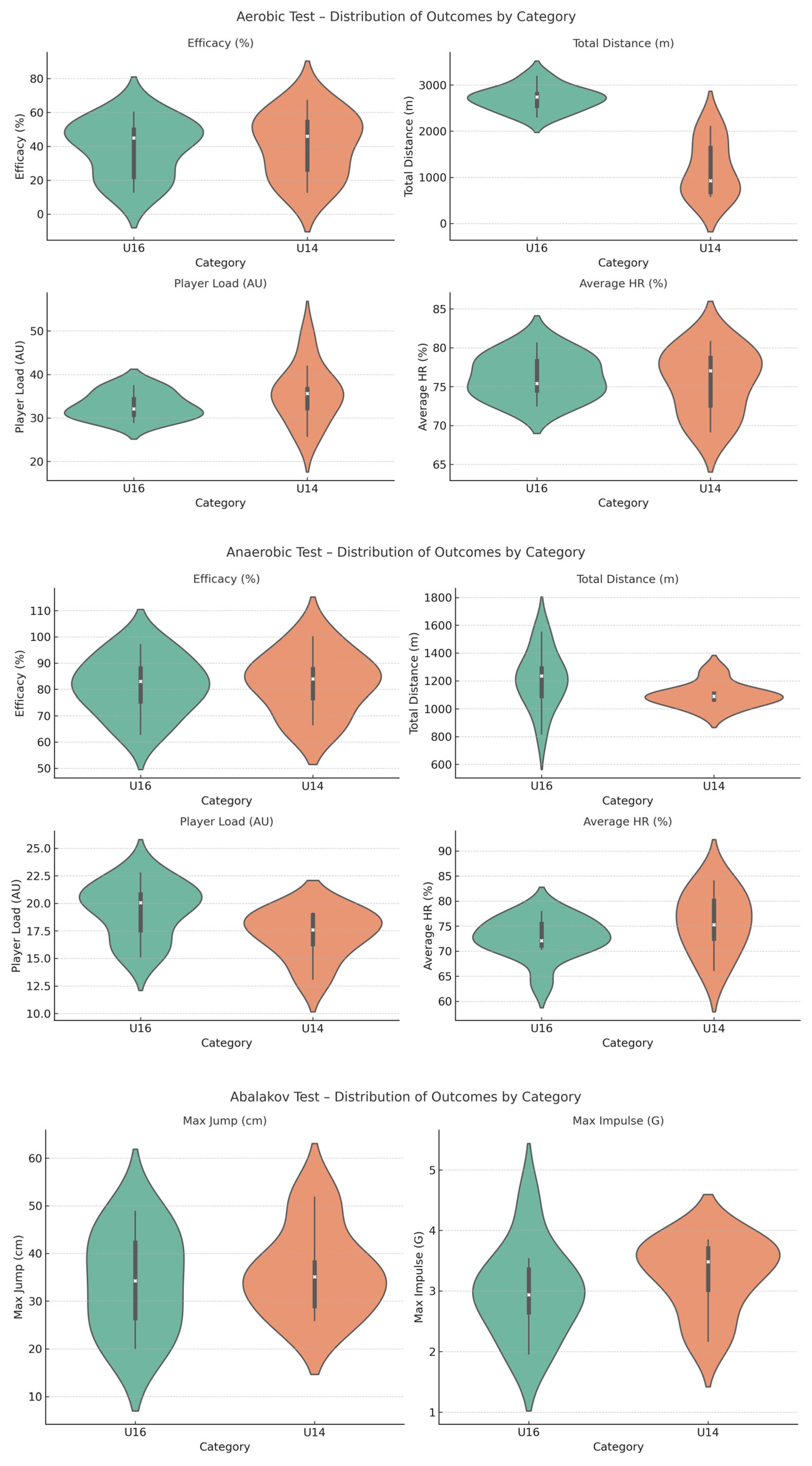 Figure 2). Violin plots were selected as they illustrate not only central tendency but also the full distribution and variability of the data, thereby providing a more comprehensive representation than traditional summary statistics. This approach allows a more precise visualization of both central tendency and intra-individual variability, facilitating the comparison between U’14 and U’16 players. U’14 players showed greater variability in aerobic (efficiency, total distance) and anaerobic (efficiency, total distance) measures, whereas U’16 players exhibited more homogeneous profiles. In jumping tests, U’16 players achieved higher mean values, with similar variability in the Abalakov test and reduced variability in the Multijump test, suggesting greater fatigue tolerance with age. Speed and agility outcomes revealed marked dispersion in U’14 players, particularly in sprint times with ball and agility measures, while U’16 players demonstrated tighter distributions consistent with improved coordination and stability. Finally, centripetal force results indicated greater heterogeneity in U’14 players and superior, more consistent performance in U’16 players, highlighting maturation-related gains in movement efficiency.