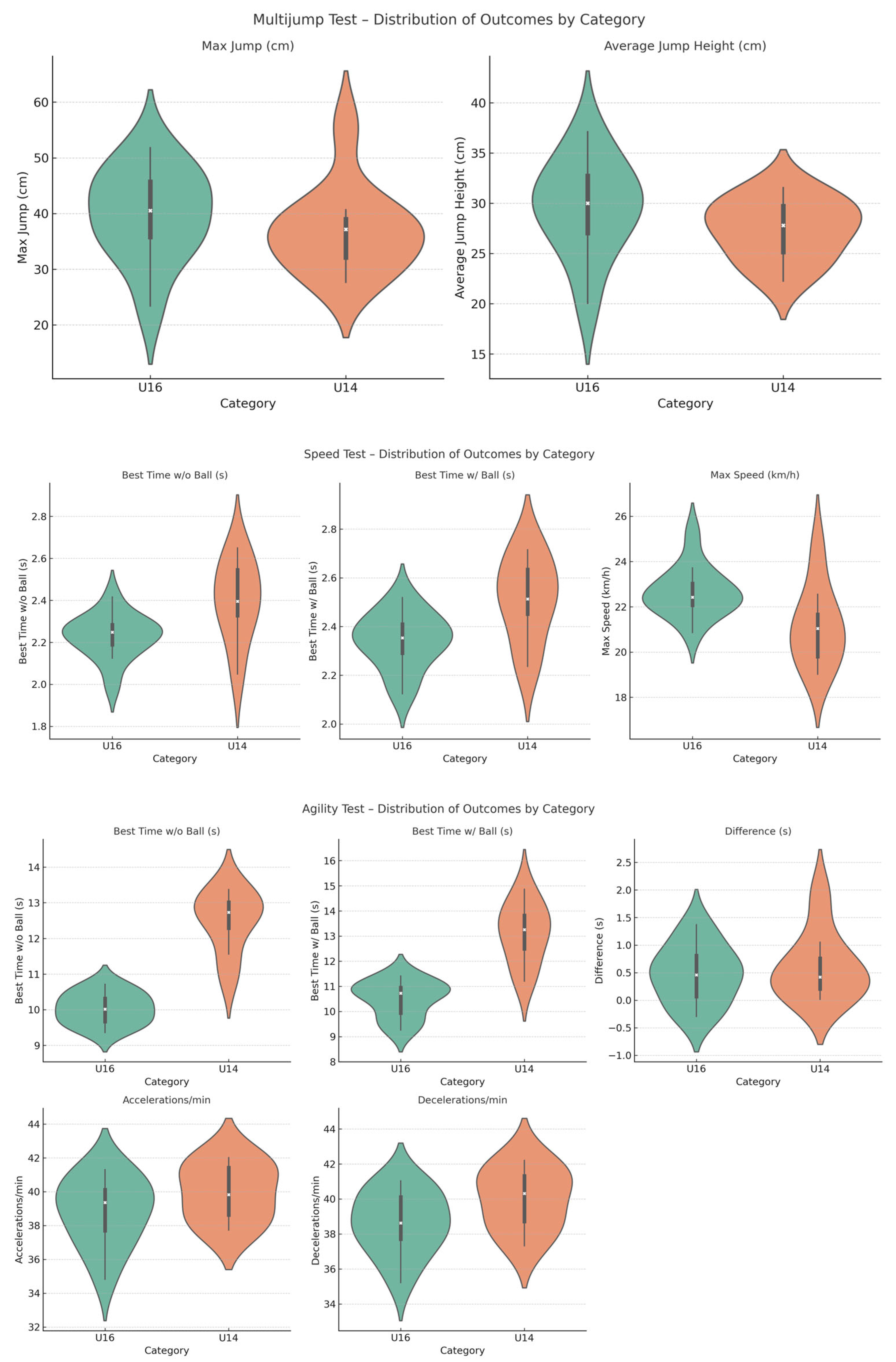 Figure 2). These plots provide a detailed view of the full distribution of individual scores, rather than summarizing them only with central tendency and spread. The violin plots confirm the presence of greater dispersion in the U’14 cohort, especially in agility and aerobic test performance, while U’16 players displayed more compact distributions around higher mean values. These visualizations reinforce the statistical findings and provide additional evidence of the role of biological maturation in reducing variability and consolidating performance profiles with age.