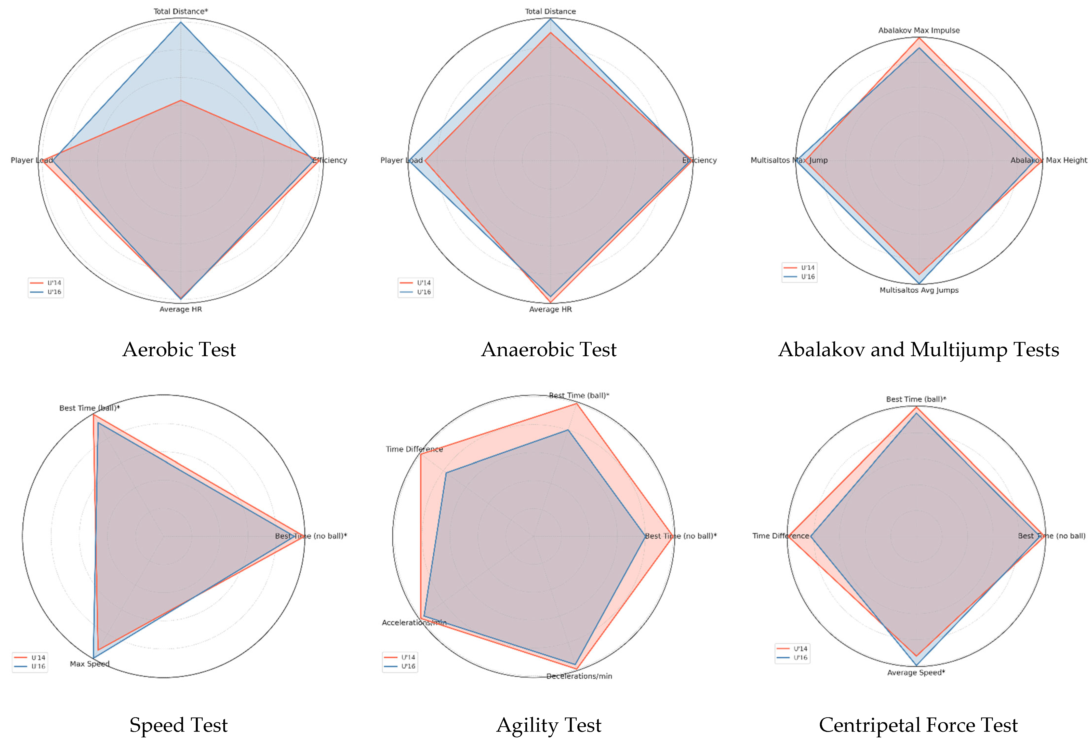 A descriptive analysis of the selected specific variables was conducted. To visually represent the differences in physical performance between the U’14 and U’16 groups, radar charts were created for each test category. Each chart was constructed using the mean values of each variable per team, previously normalized to facilitate relative comparison between dimensions with different measurement units [