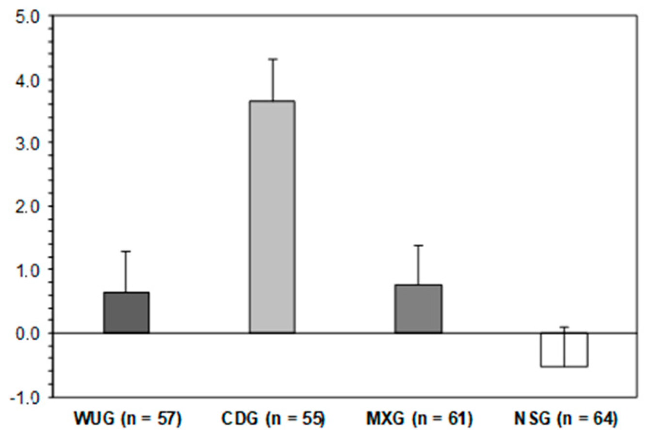 d = 0.71). However, between the WUG, MXG, and NSG schoolchildren, statistically significant differences were not found (