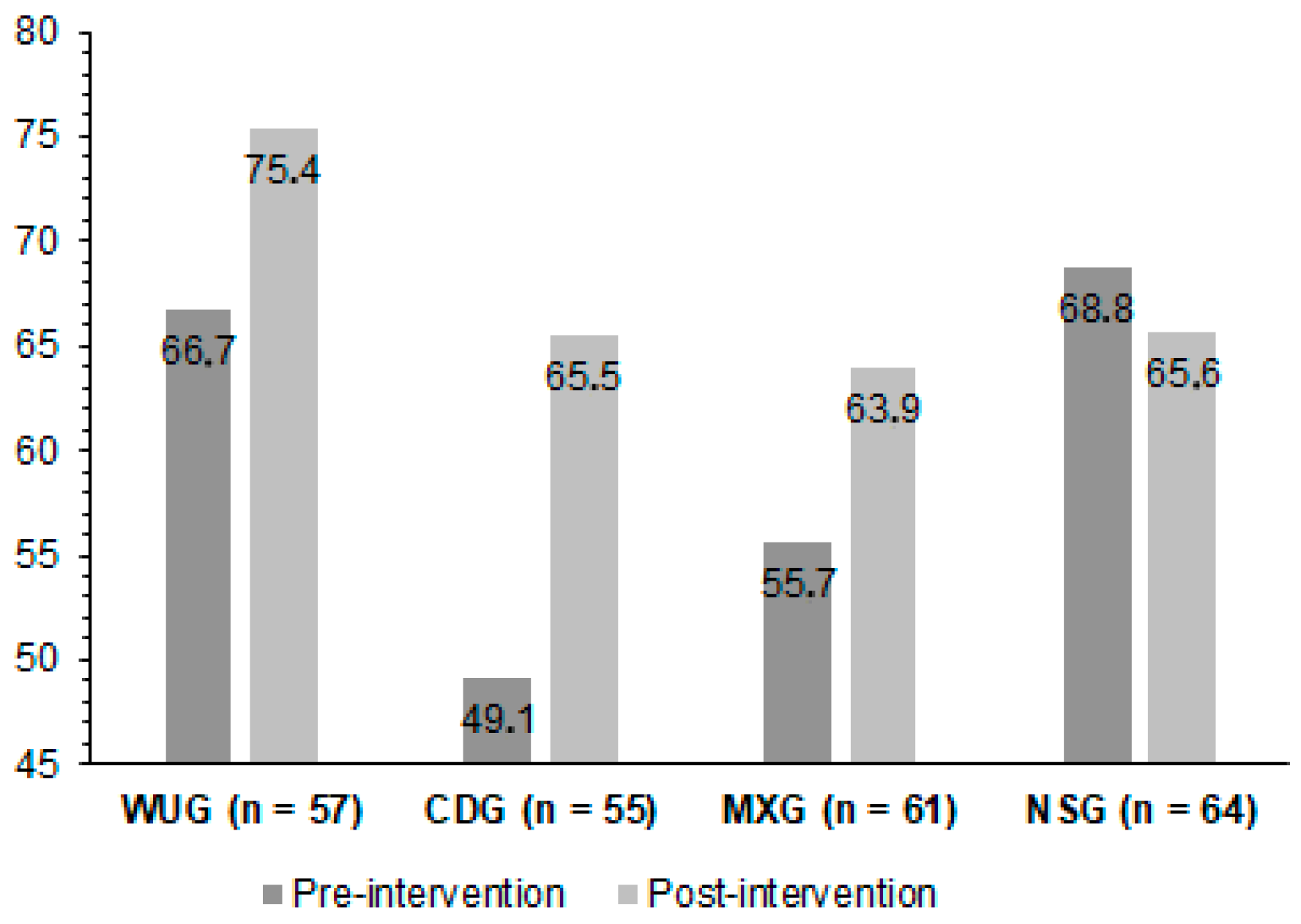 32]. The maximum likelihood estimation method was used. Subsequently, the post hoc between-group pairwise comparisons with the Bonferroni adjustment were carried out. Since none of the potential confounding variable explored (i.e., gender, grade, body mass, height, body mass index, and pre-intervention BSSR scores) showed statistical significance, covariables were not included. Moreover, the results of the MLM with participants nested within classes as random effects, and with the between-group factor group (WUG, CDG, MXG, NSG) as fixed effects on the pre-intervention BSSR scores, followed by the pairwise comparisons with the Bonferroni adjustment showed that there were no statistically significantly differences between groups (