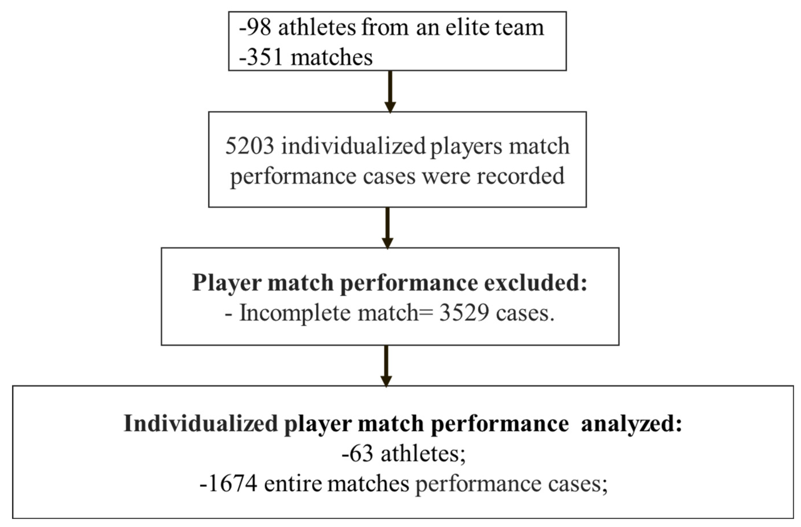 Match performance data (N = 5203 cases) were collected from 99 male professional football players (age 18 to 40 years; weight, 76 ± 6 kg; height, 178 ± 6 cm) belonging to the Brazilian First Division team during the 2020 to 2024 seasons. Data corresponding to 351 official matches from the five seasons were analyzed. The season (with the first official match) starts in January and ends in November or December. Only match performances of the entire match were included in the analysis. This ensures that only starters enter the analysis, thus decreasing bias related to match performance [