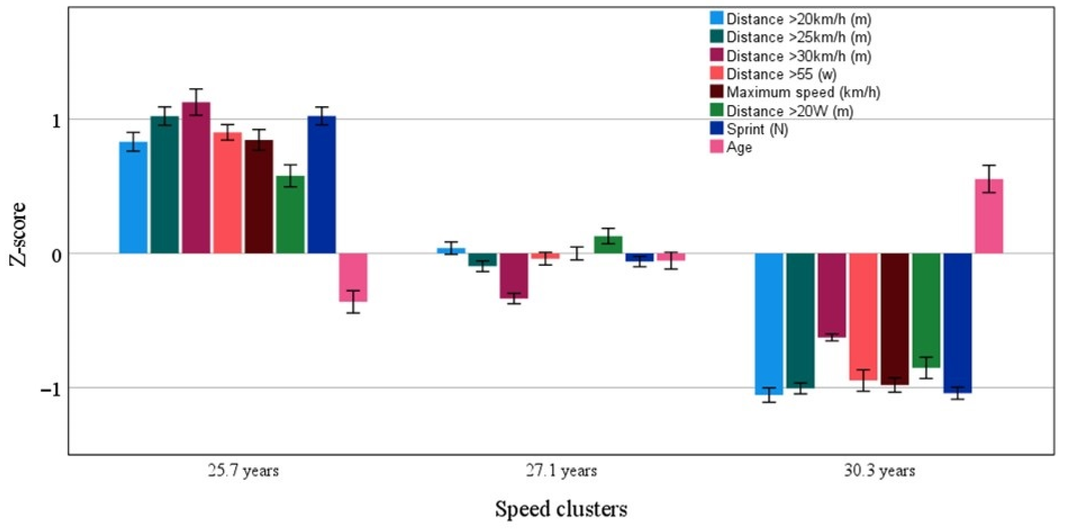 Figure 5, the analysis revealed that clusters at ages 25.7 years old (CI 25.3/26.1 years; Numbers (N) = 415 performance cases) and 27.1 years old (CI 26.8/27.5 years; N = 730 performance cases) have superior performance when compared to the 30.3-year-old (CI 29.7/30.8 years; N = 452 performance cases) cluster. Moreover, the 25.7-year-old cluster had higher performance in all variables when compared to the other two clusters. This methodology allowed us to pinpoint the age group that excelled in speed capabilities.