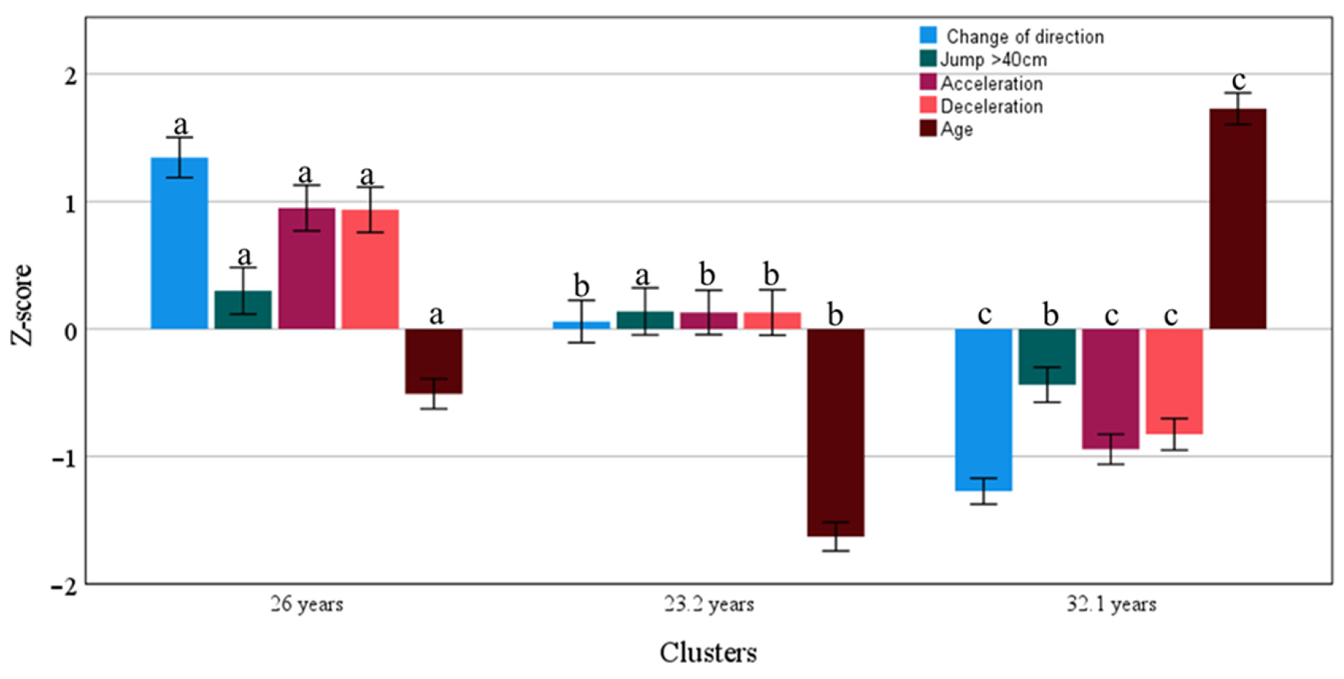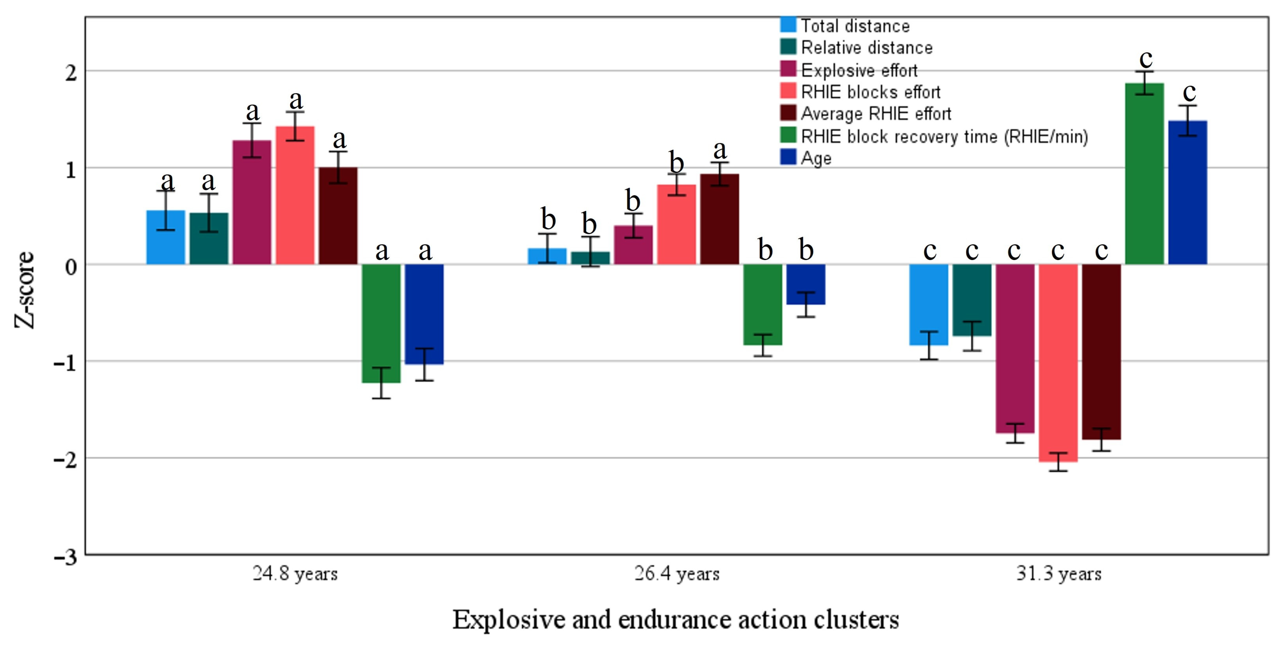 Figure 6, the k-means identify that the best match performance was from a cluster formed at age 24.8 (CI 24.4–25.3 years; N = 404 performance cases), which presents better performance in the endurance and explosive variables when compared to clusters formed at ages 26.4 (CI 26.0–26.7 years; N = 595 performance cases) and 31.3 (CI 30.9–31.7 years; N = 530 performance cases).
