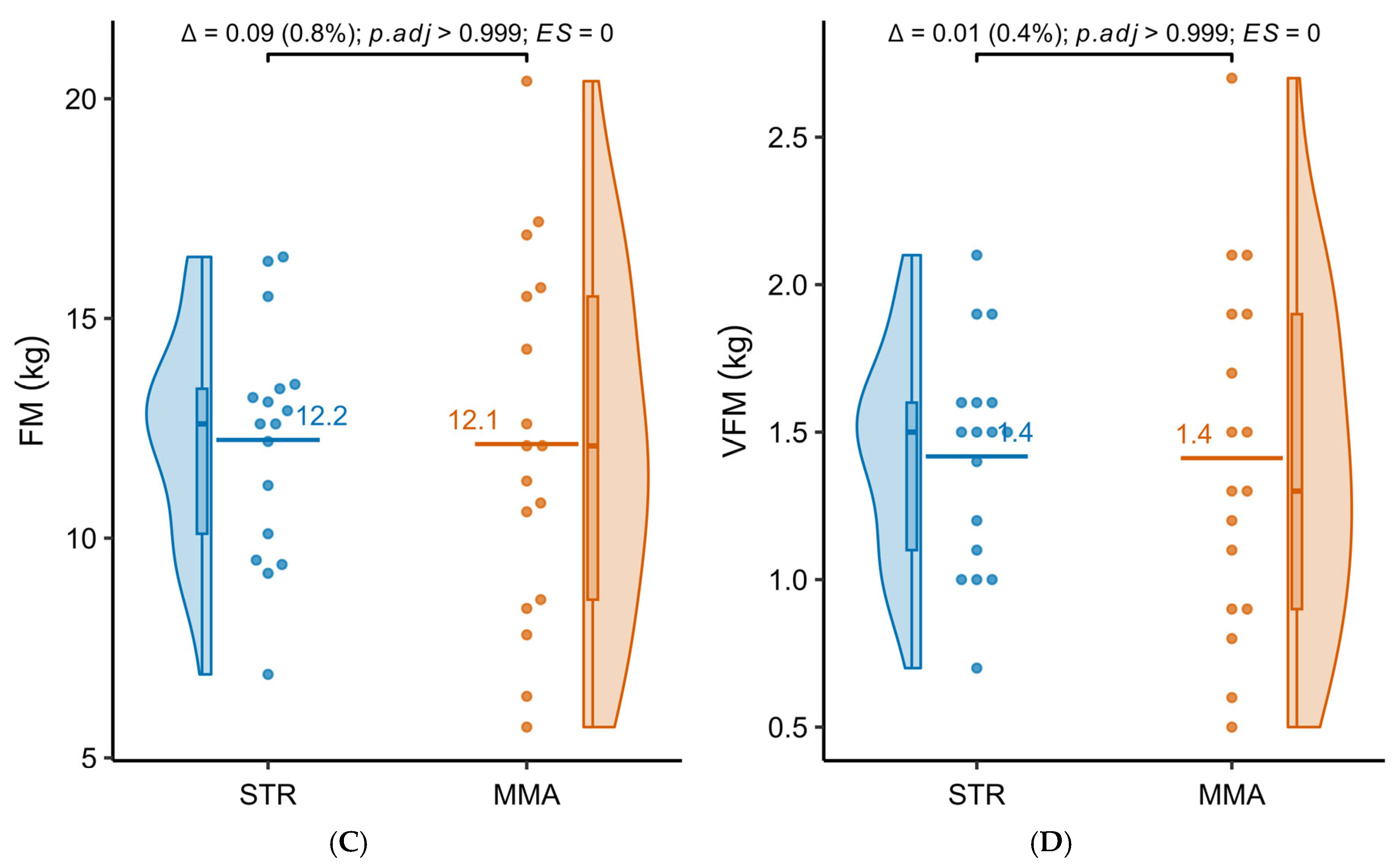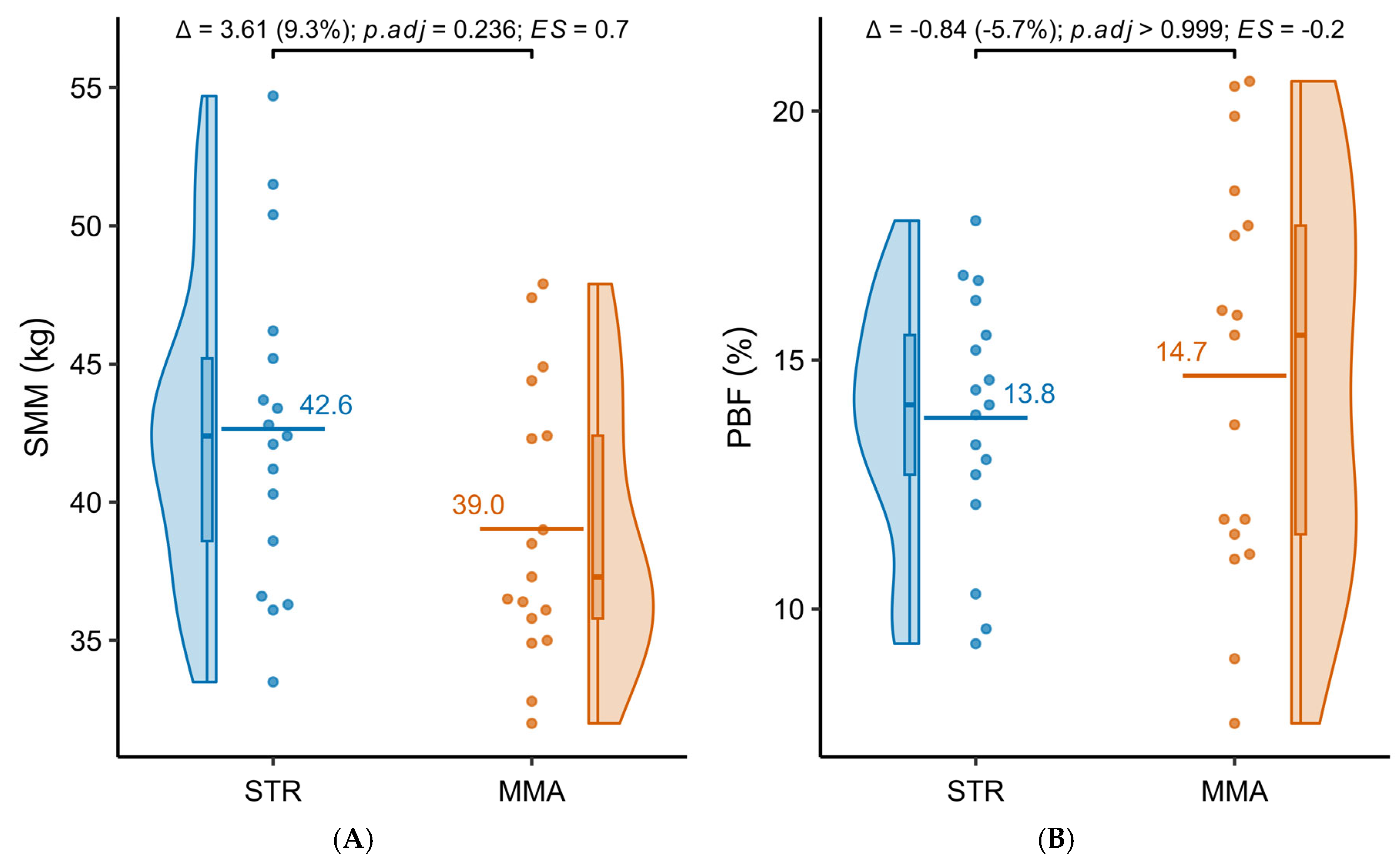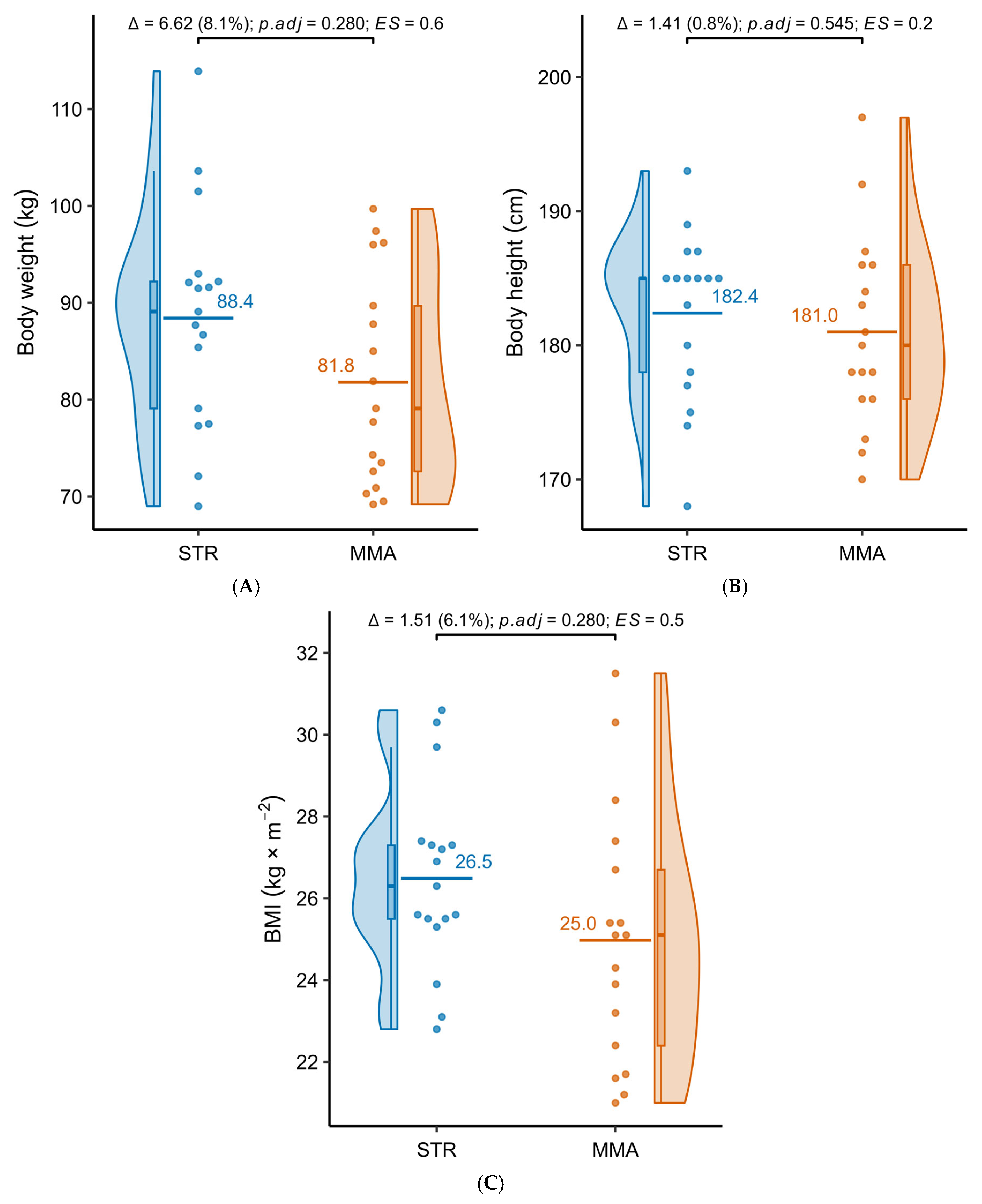In STR, it is relatively easy to determine requirements and dependencies between main biomotor skills (strength–speed–endurance), while in MMA, it may strongly depend on the style and preferred tactic of an individual athlete. In this context, comparing the effects on body composition of these disciplines, which have different training and biomechanical characteristics, may also help to understand the physiological outcomes of these characteristics.