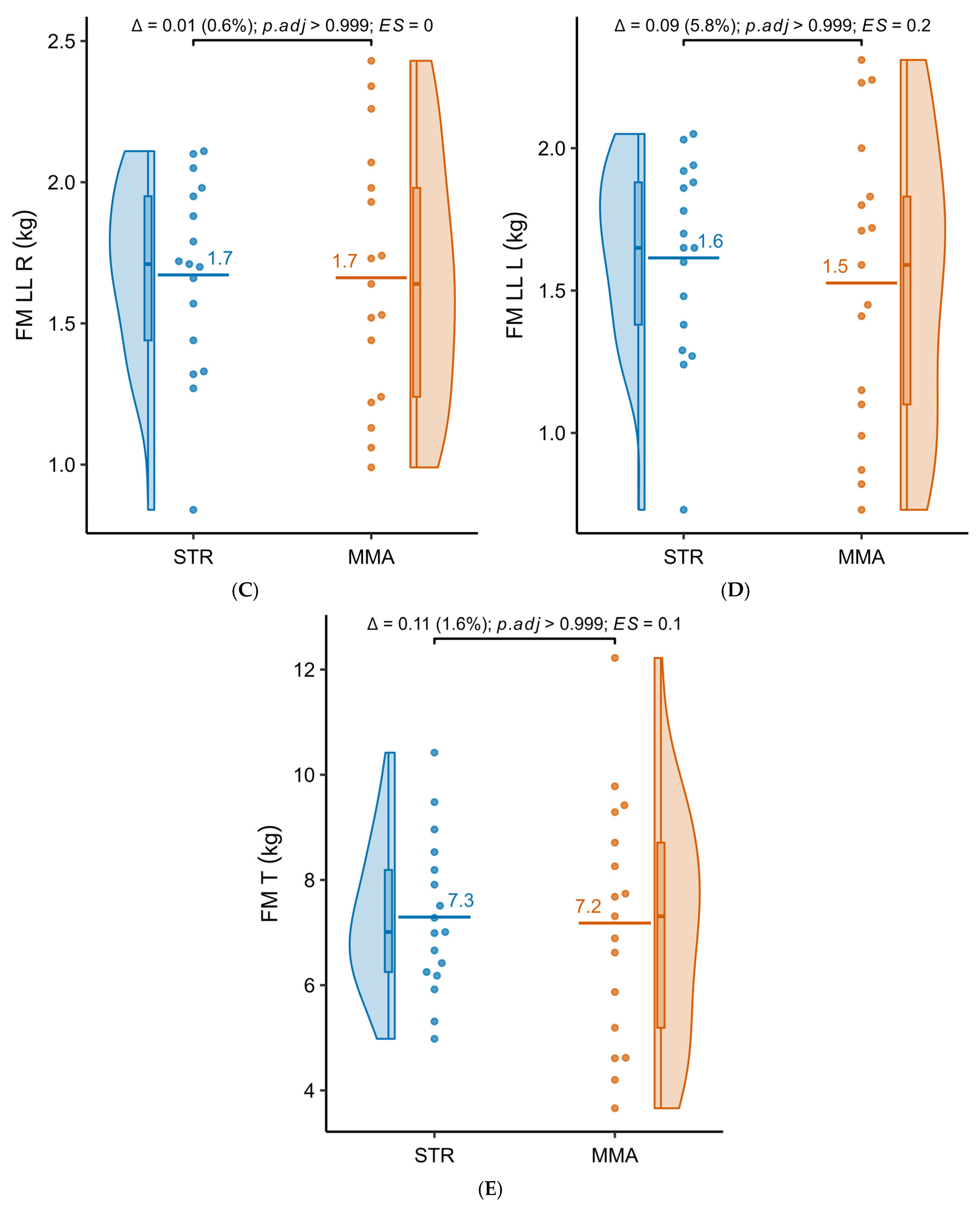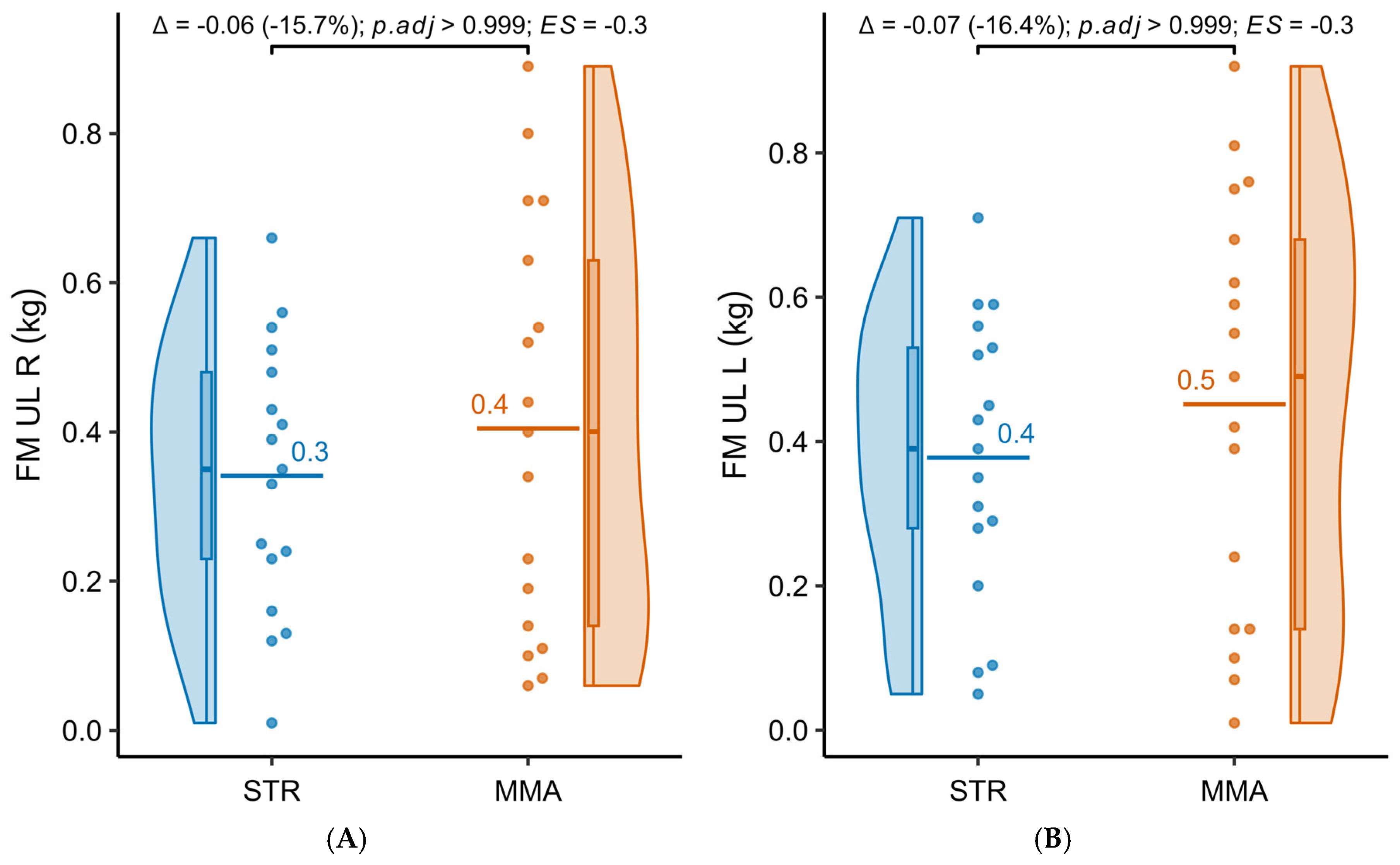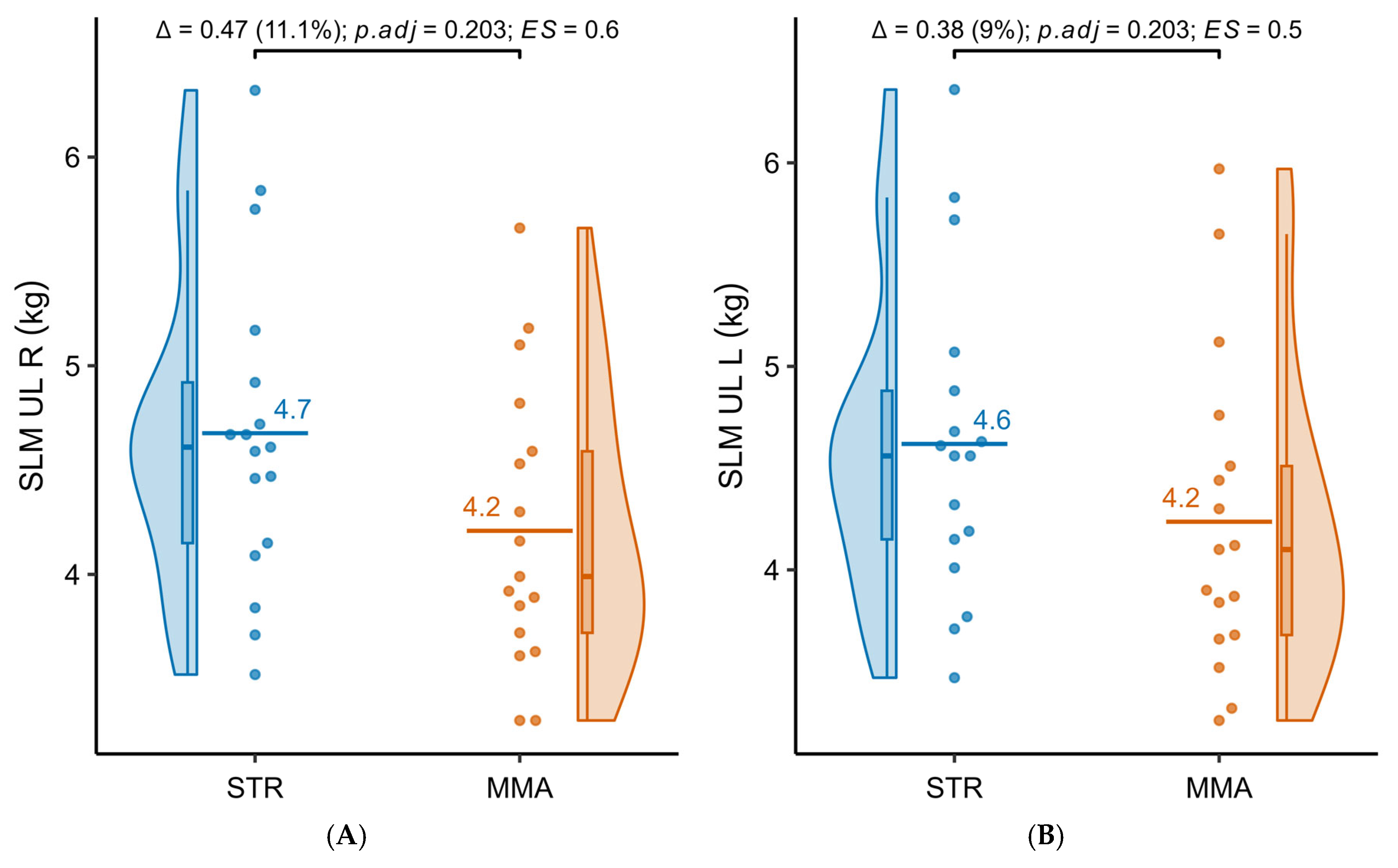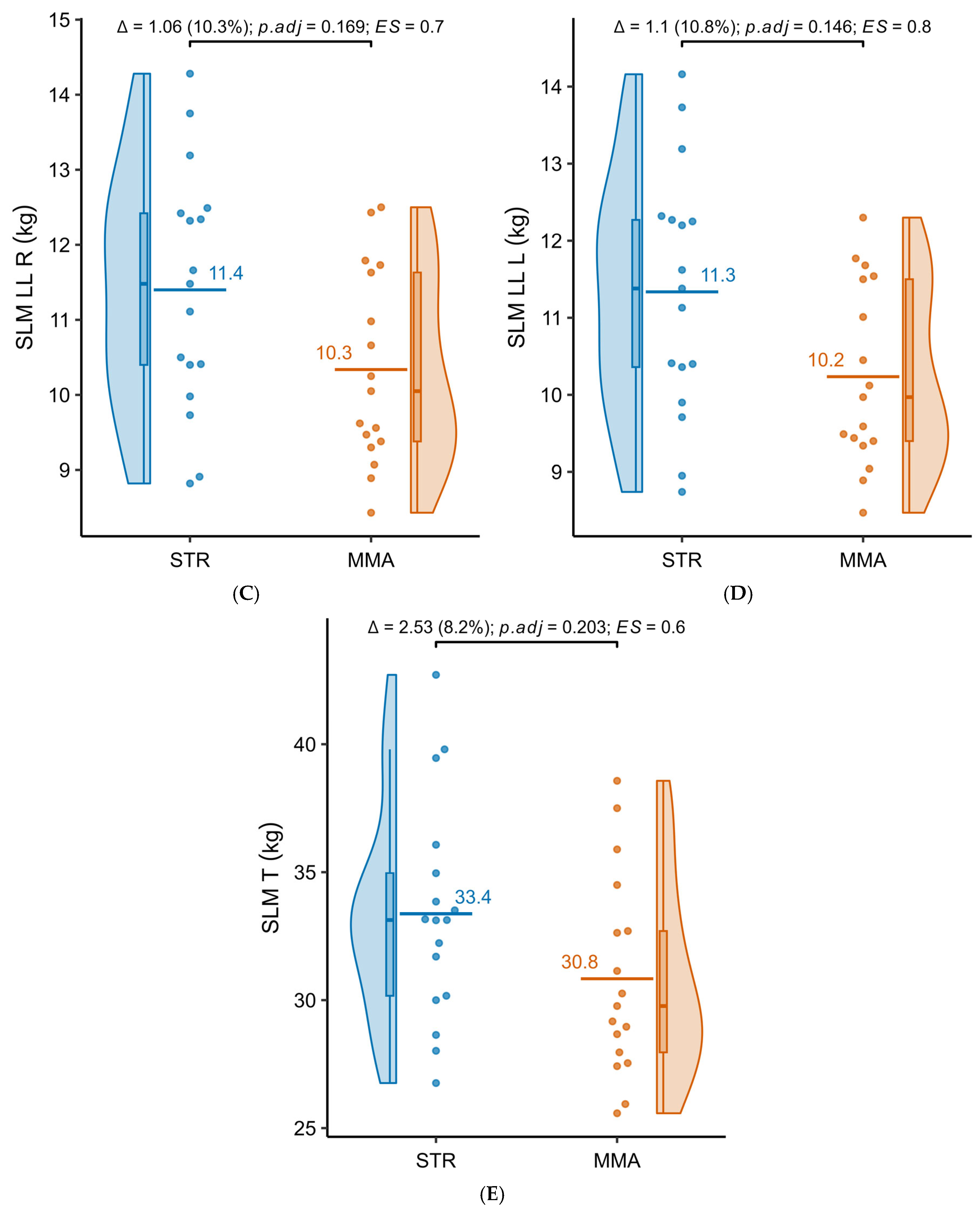 44]. Between-group comparisons of powerlifting (STR) and mixed martial arts (MMA) athletes were carried out using independent-samples Student’s t-tests, testing H