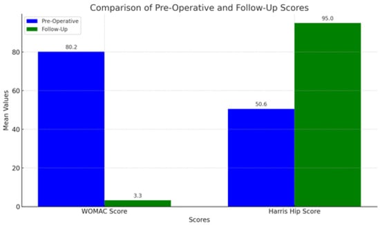 Clinical outcomes were assessed using the Harris Hip Score (HHS) and the Western Ontario and McMaster Universities Arthritis Index (WOMAC). Preoperatively, patients showed marked functional impairment, with a mean Harris Hip Score (HHS) of 50.6 and a mean WOMAC score of 80.2, indicating poor function and substantial pain (Figure 1), (Table 3).
