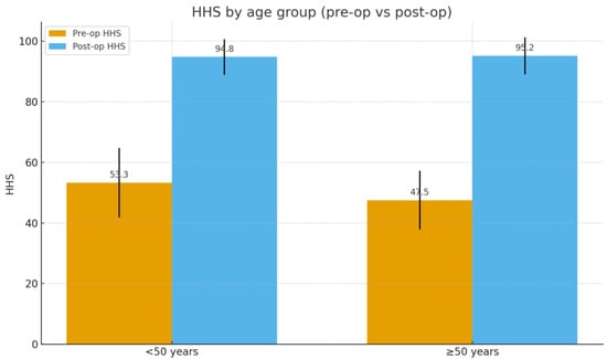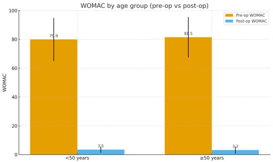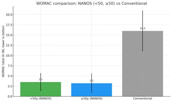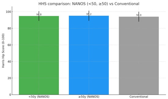 To further strengthen this comparison, we analyzed our results stratified by age groups (<50 years and ≥50 years) against published benchmarks for conventional stems. As illustrated in Table 7 and Figure 6 and Figure 7, postoperative HHS was excellent in both subgroups (94.8 ± 5.8 in patients <50 years; 95.2 ± 6.1 in those ≥50 years) and comparable to values reported for conventional cementless stems in young patients from the study by Kim et al. []. WOMAC scores at final follow-up were similarly favorable in both NANOS subgroups (3.5 ± 2.2 vs. 3.2 ± 2.4), and distinctly lower than those typically reported for the conventional stem group (16.0 ± 5.0) []. These findings confirm that short stems, including the NANOS design, achieve outcomes at least equivalent to conventional stems, while offering the additional advantage of bone preservation and simpler revision options.