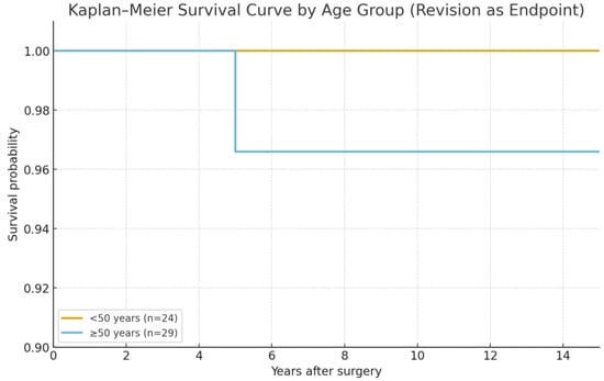 Kaplan–Meier survival analysis, using revision for any reason as the endpoint, demonstrated an overall implant survivorship of 98.1% (95% CI: 94–100%) at 15 years. When stratified by age, patients younger than 50 years (n = 24) showed a survival rate of 100%, while those aged 50 years or older (n = 29) had a survival of 96.6% (95% CI: 90–100%). No statistically significant differences were observed between groups (log-rank test, p > 0.05) (Figure 5).