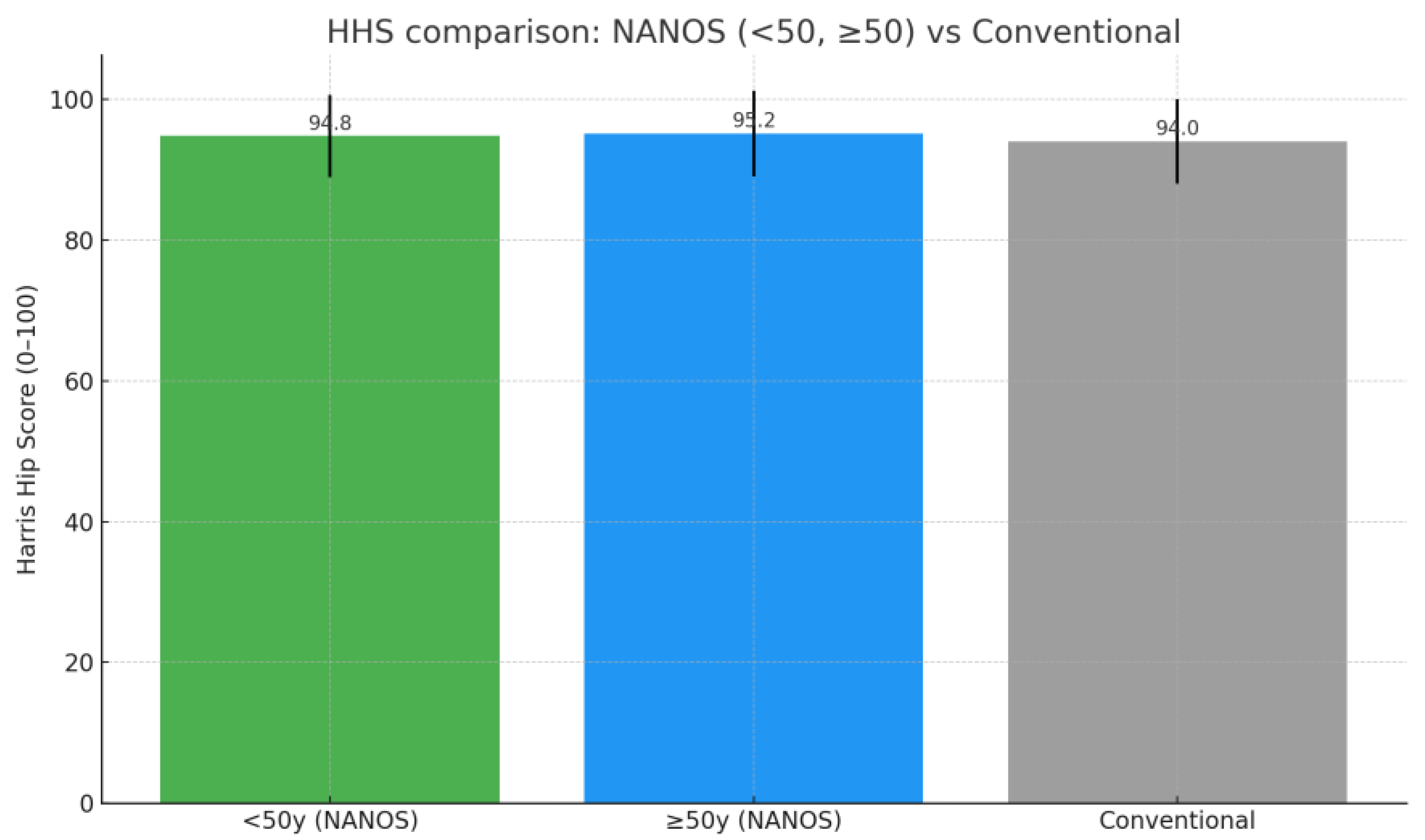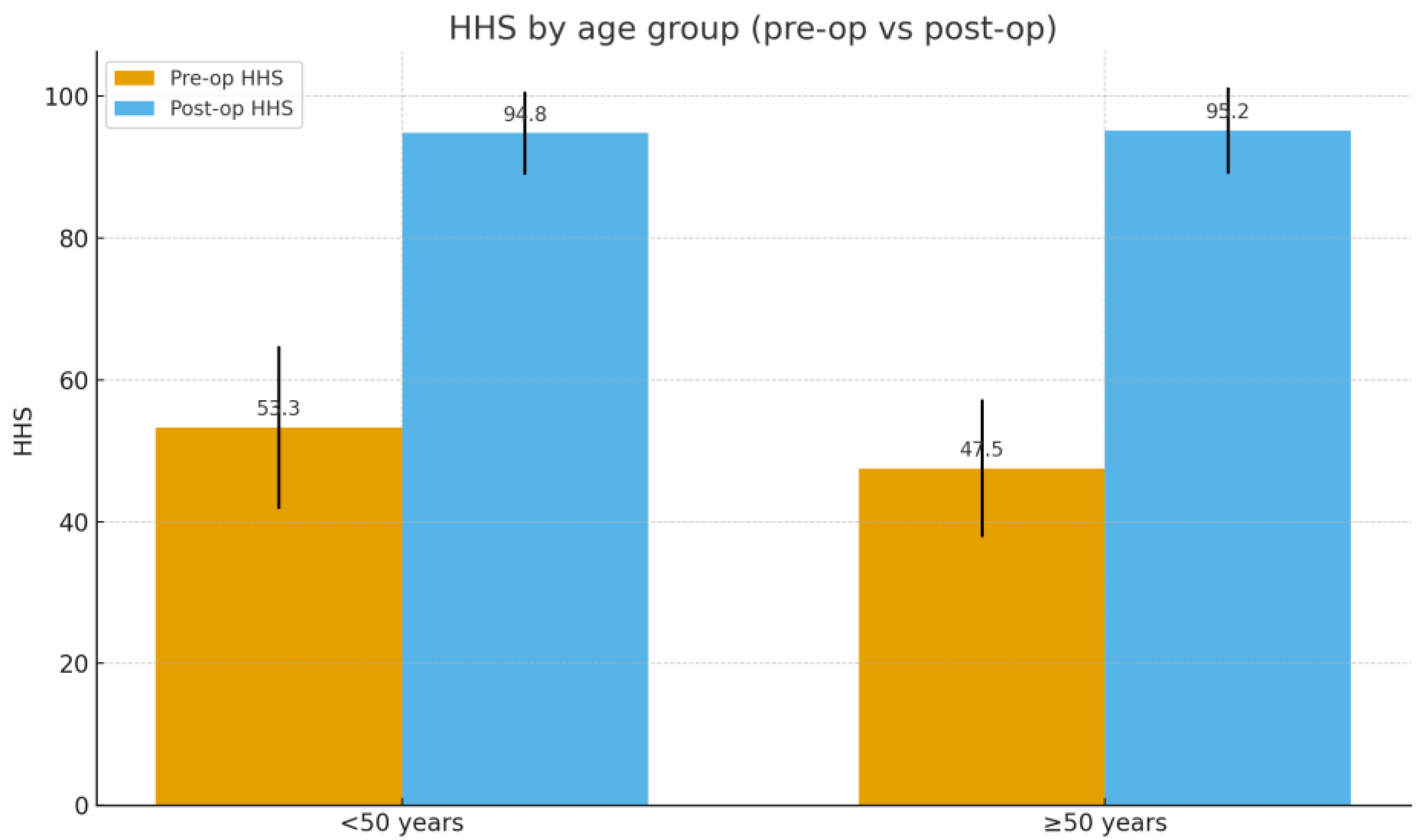 - HHS: Mean score of 95, indicating excellent recovery, significant functional improvement, and minimal pain.