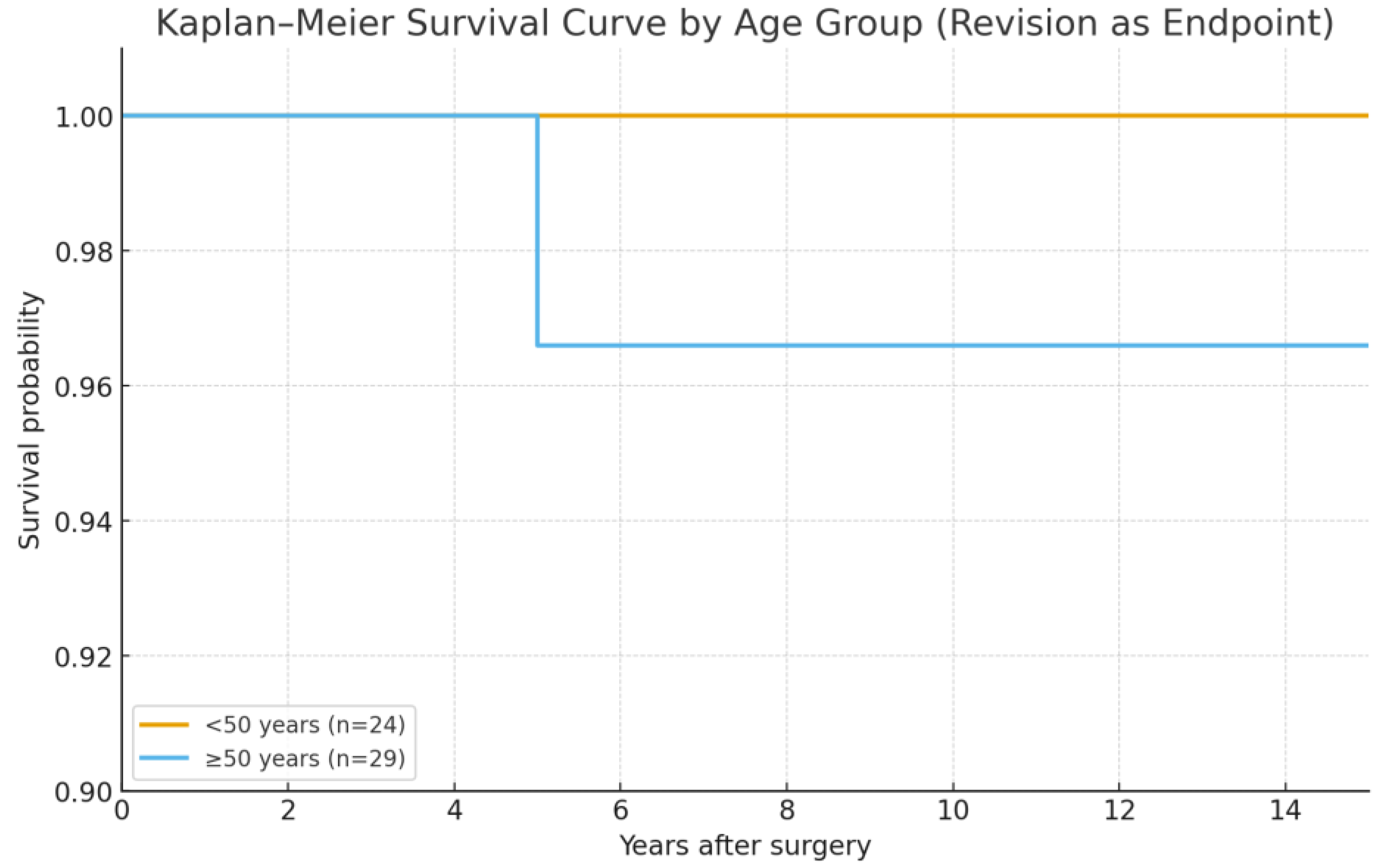 - Dislocation: Two patients experienced postoperative dislocation during bed transfers. Both patients were obese, and the dislocations occurred early in the recovery period. The dislocations were successfully managed with closed reduction, and no further dislocations were reported.