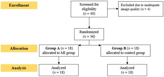 To determine the minimum required sample, we performed a priori sample-size calculation (IBM SPSS v27, IBM, Armonk, NY, USA) for a two-tailed test with an alpha level (α) of 0.05 and power = 80%. The required total sample was 34 participants (17 per group). For n = 34, the calculated power was 0.802 with a Type I error of 5% and a Type II error (β) of 0.198. Ultimately, we enrolled 36 participants, with 18 assigned to each group.