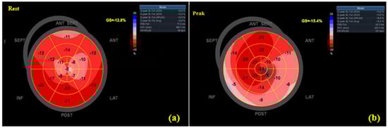 GLS bull’s-eye plots at rest (a) and peak (b) in a healthy control (absolute GLS increases at peak).