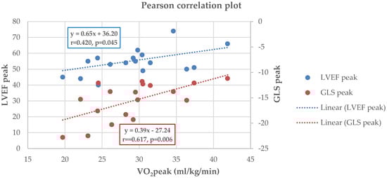 Pearson analysis between VO2peak and GLSpeak (r = 0.617, p = 0.006) and VO2peak and LVEFpeak (r = 0.420, p = 0.045) in the MI group; regression lines displayed with equations y = β0 + β1x.