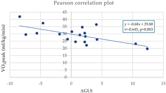Data analysis was performed using IBM SPSS v27 (IBM, Armonk, NY, USA). The Shapiro–Wilk test was used to assess normality. As all variables were normally distributed, continuous data are presented as mean ± SD, and parametric tests were applied. Between-group comparisons used independent-samples Student’s t-tests. Effect sizes were calculated for all comparisons using Cohen’s d for t-tests (with thresholds of 0.2, 0.5, and 0.8 indicating small, medium, and large effects, respectively) and Cramer’s V for categorical variables. Intra-observer reproducibility was assessed using intraclass correlation coefficients (ICC) calculated with a two-way mixed-effects model, absolute agreement, average measures [ICC(3,k)]. Pearson correlation examined associations between CPET variables (VO2peak, VE/VCO2) and echocardiographic indices (LVEF, GLS, ΔGLS). Simple linear regression was performed to model these associations, and the regression equations (y = β0 + β1x), together with r and p values, are presented in the figures. A post hoc power calculation for the primary outcome (between-group ΔGLS) indicated power >80% at α = 0.05. Statistical significance was set at p < 0.05.