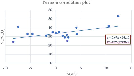Pearson analysis between VE/VCO2 slope and ΔGLS (r = 0.539, p = 0.020) with regression line and equation.