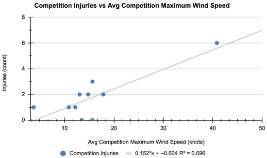 A significant positive relationship was observed between average maximum wind speed and the number of competition injuries (R2 = 0.70, p = 0.001). Wind speed data were obtained from local weather stations via Weather Underground [10].
