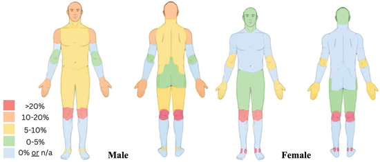 Coloured regions indicate the proportion of reported injuries at each anatomical site: red (>20%), orange (10–20%), yellow (5–10%), green (0–5%) and blue (0% or not applicable). Differences in injury distribution between male and female athletes include a higher prevalence of head, neck, shoulder and hand injuries among male athletes and ankle injuries among female athletes.