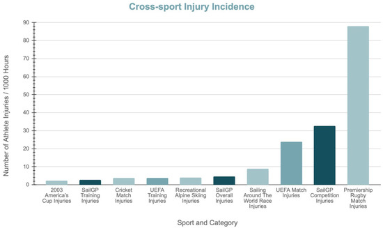 Injury incidence per 1000 h across multiple sailing events and a selection of high-performance sports [14,16,18,19].