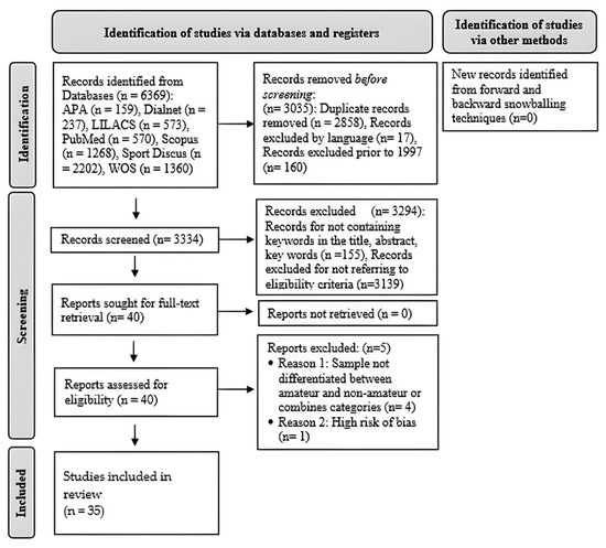 Figure 1 shows the flowchart for the present review. In phase 1, identification, 6369 registries were retrieved, 3294 of which were discarded because they were duplicated, published before 1997, or were not published in English, Spanish, or Portuguese. In phase 2, screening, the remaining 3334 records were checked against eligibility criteria, discarding a total of 2962 registries for the reasons shown in Figure 1. Then, the full text for the 40 remaining studies was screened against the same eligibility criteria and risk of bias. Four studies [38,39,40,41] were excluded as they did not meet the inclusion criteria and one [42] was excluded due to high risk of bias. The identification of studies via other methods (forward and backward snowballing techniques) did not result in any new study being included. Finally, 35 studies were included in the review.